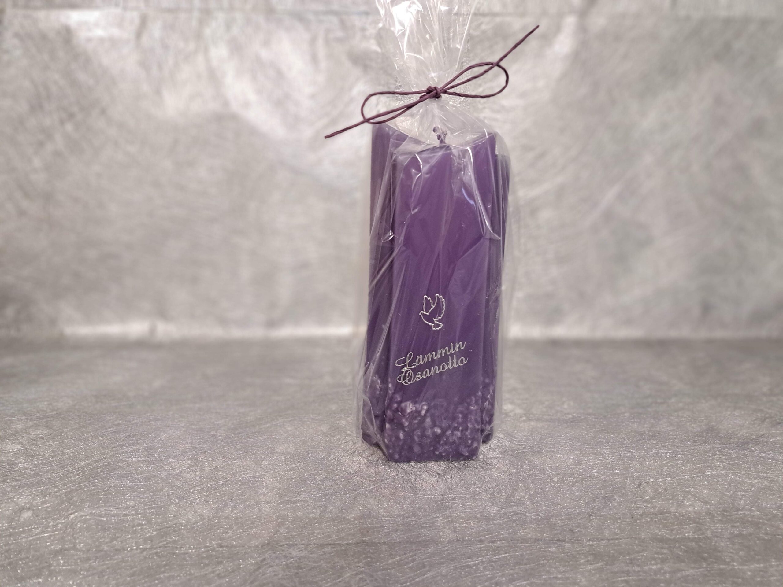Kynttilä on pakattu sellofaanipussiin.