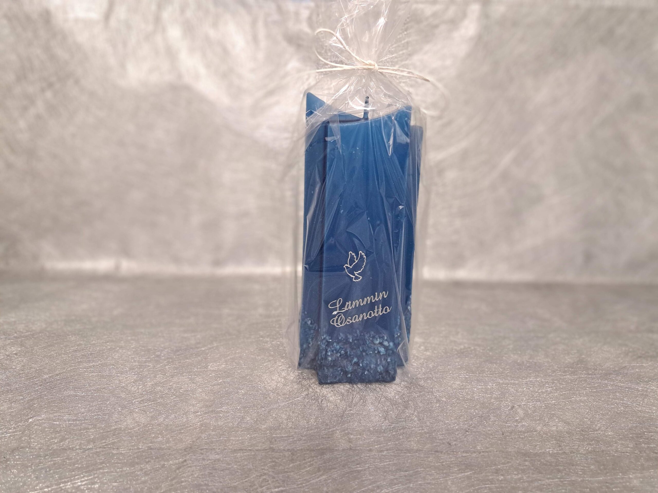 Kynttilä on pakattu sellofaanipussiin.
