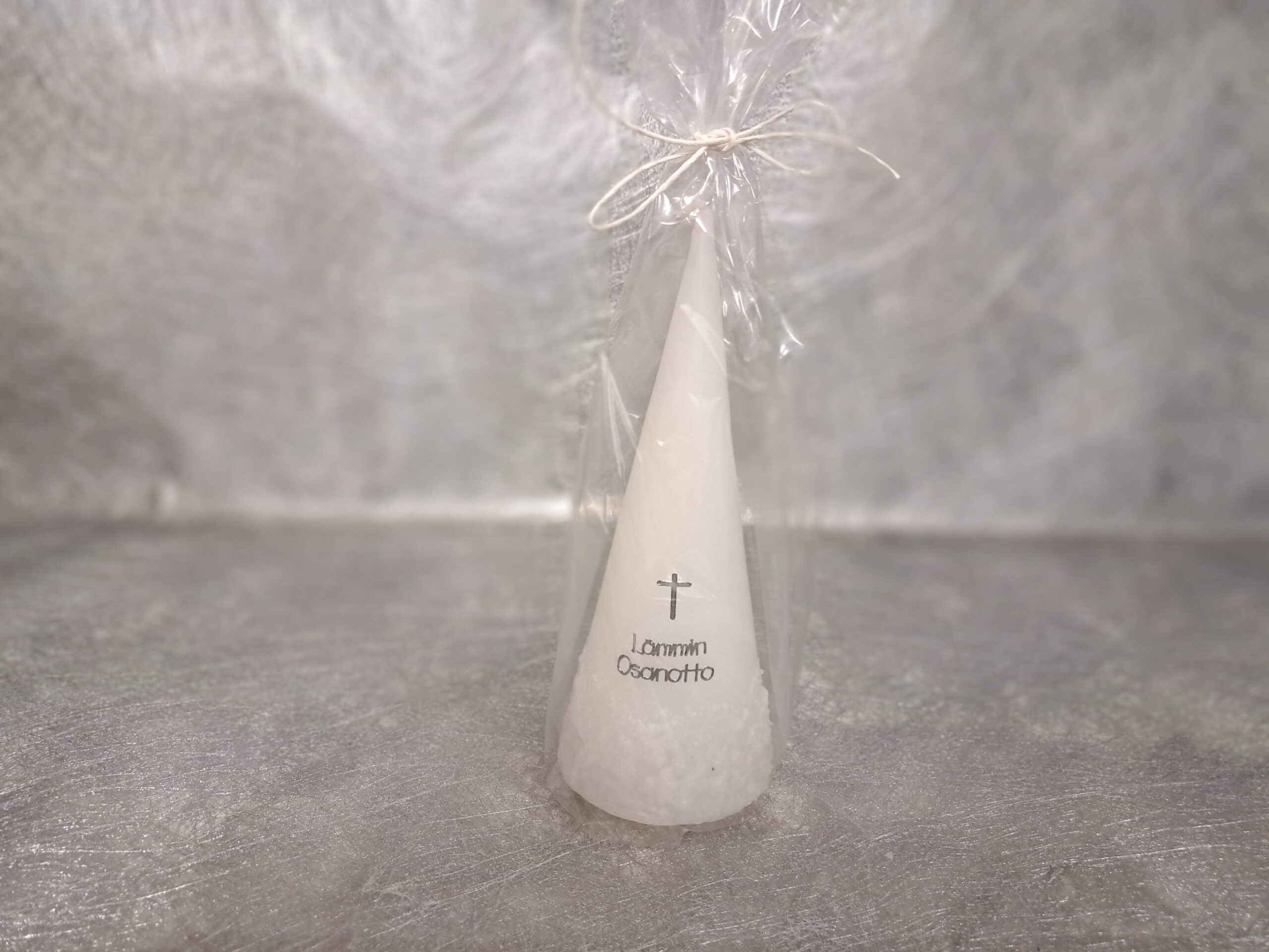 Kynttilä on pakattu sellofaanipussiin.